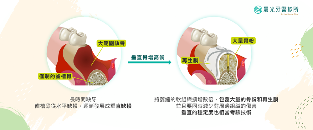垂直骨增⾼術(Vertical Bone Augmentation)是⼀種專⾨針對嚴重⿒槽骨⾼度不⾜的補骨技術。當患者因外傷、牙周病、長期缺牙或植牙失敗導致骨質⼤量流失,造成植牙區域骨⾼度不⾜時,垂直骨增⾼術可以幫助重建⿒槽骨,使其達到⾜夠的⾼度來⽀撐植牙。