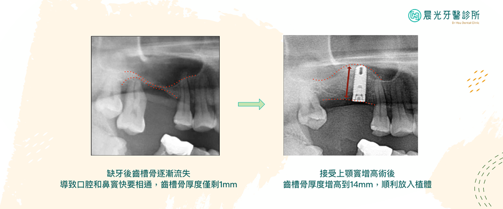 該⼿術旨在增加上顎骨的垂直⾼度,補⾜適量的⿒槽骨,以便有⾜夠的骨量植入植體。